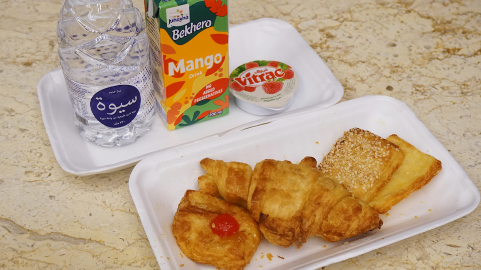 ホテルのテーブルに広げたのは、今日の早朝クルーズ船を下船時にいただいた朝食ボックスの中身です、夜食代わりに少しつまみます。
