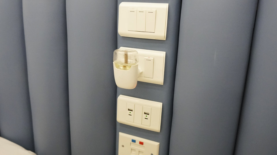 ベット中央にある各スイッチ類、USBポートも完備、コンセントに刺さっているのは芳香剤?でしょうか。