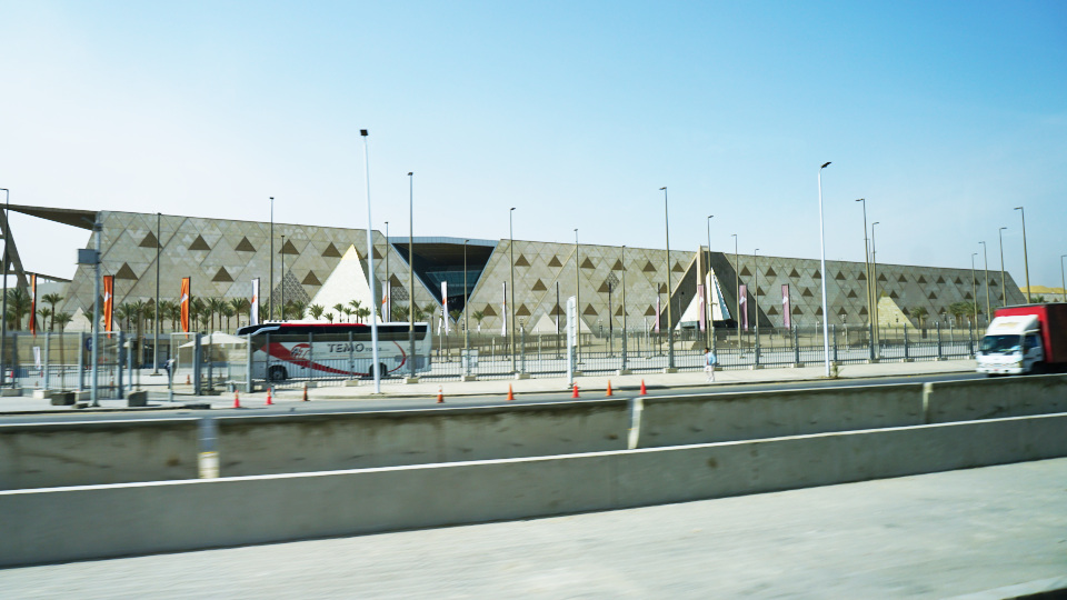 車窓からの「大エジプト博物館」、宿泊したホテルが近くなので何度か建物の横は通り過ぎるのですが、立ち寄ることはありませんでした。