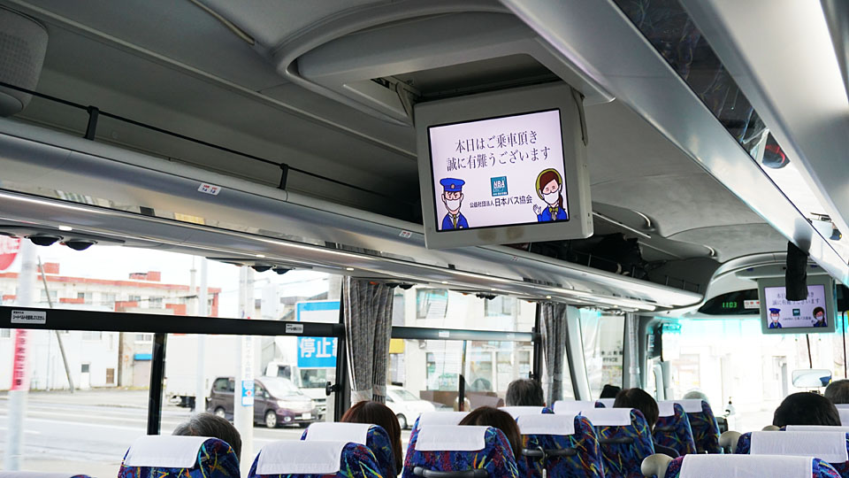 しかし、なんと新兵器登場、中央通路の上に収納されたモニターで、安全運転のご案内をアナウンス、その後バスガイドさんが「バスガイド付きツアー」を十分に堪能させてくれる、札幌市内から丁寧かつ情報量満載のガイディングしてくれます。