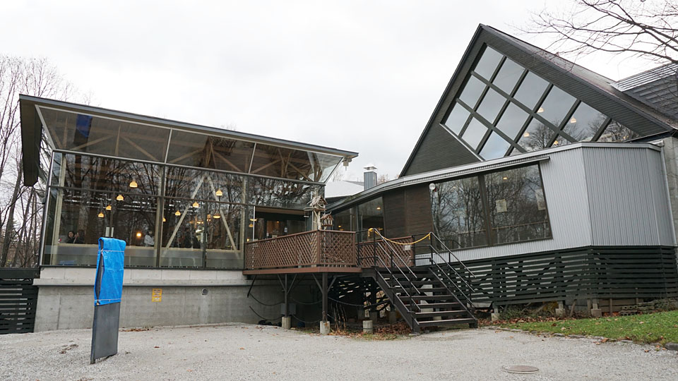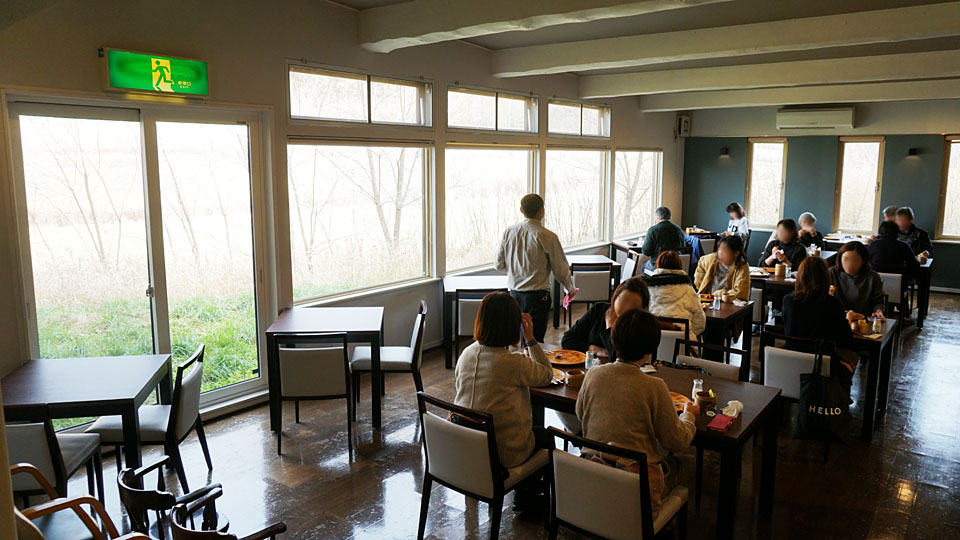 食堂はこんな感じ、左側の大きな窓は季節ごとに表情を変えた風景が見られるんでしょうね、もちろんまだ雪景色ではありません。