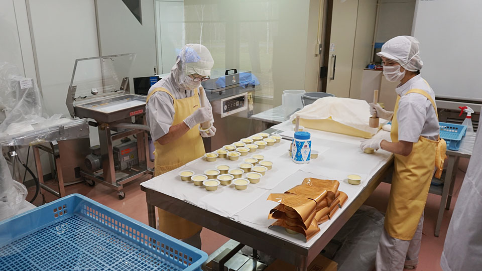 中に入ると先ずチーズの制作過程を、ガラス越しに見学することができます、この日はこんな作業をしていました。