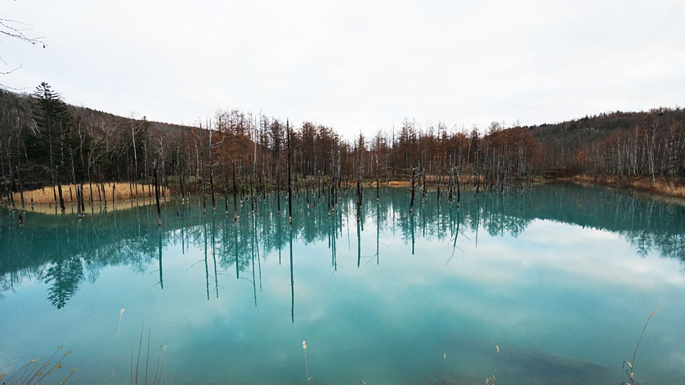 「青い池」に到着、駐車場から遊歩道を歩いてこの景色に遭遇します、バスガイドさん手作りの写真スポットマップを参考にお写真タイム、日の光がもう少しあれば、もっと青い池に出会えたかもしれません。
