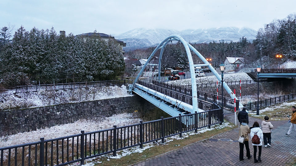 次に向かうのは「白ひげの滝」白金温泉は標高626メートル地点「青い池」よりもさらに100メートル以上登ってきたので、雪の量がグットふえ、寒さも一段と増します、この橋の左側にもう一つトラス橋があって、そこからお目当ての滝を見ることに。