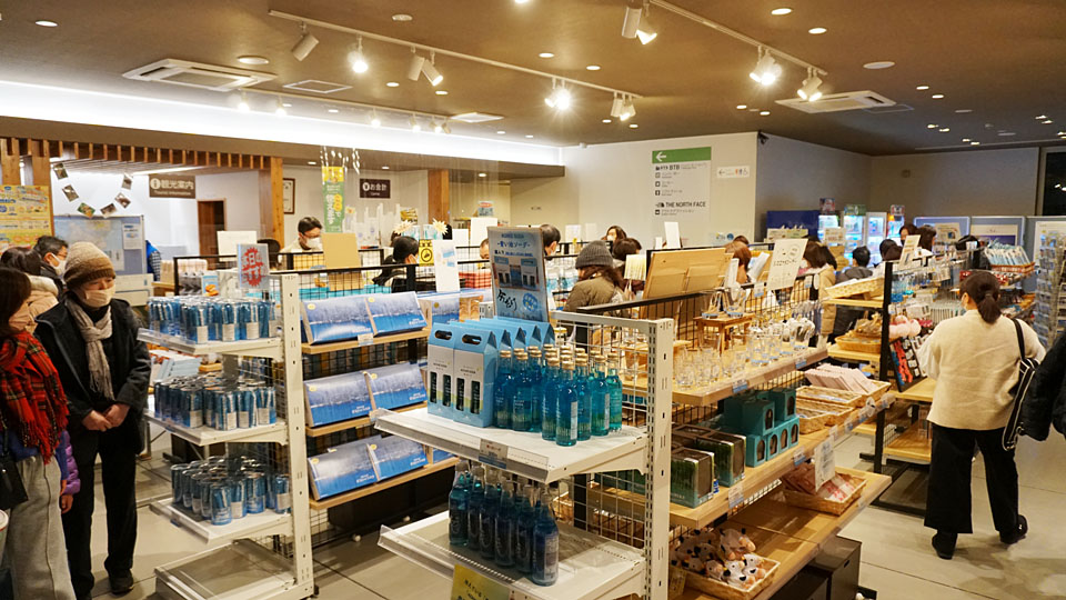 お店の中はこんな感じ、ここはオリジナルの「青い池土産」が満載です。