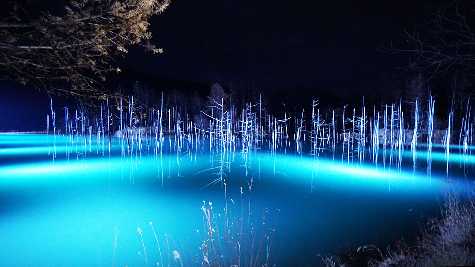 いよいよ「青い池」に戻ってライトアップを待ちます、池までの遊歩道はかなり暗くなり、一度来ているので携帯のライトでも何とかなりますが、できれば懐中電灯を準備した方がいいかも。