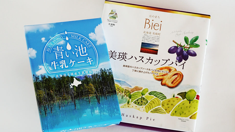 お土産に購入したのはこの2点、あくまでも予算内、お買い物クーポン券1000円分を少し超えるチョイスです、青い池牛乳ケーキ486円、美瑛ハスカップパイ670円也。